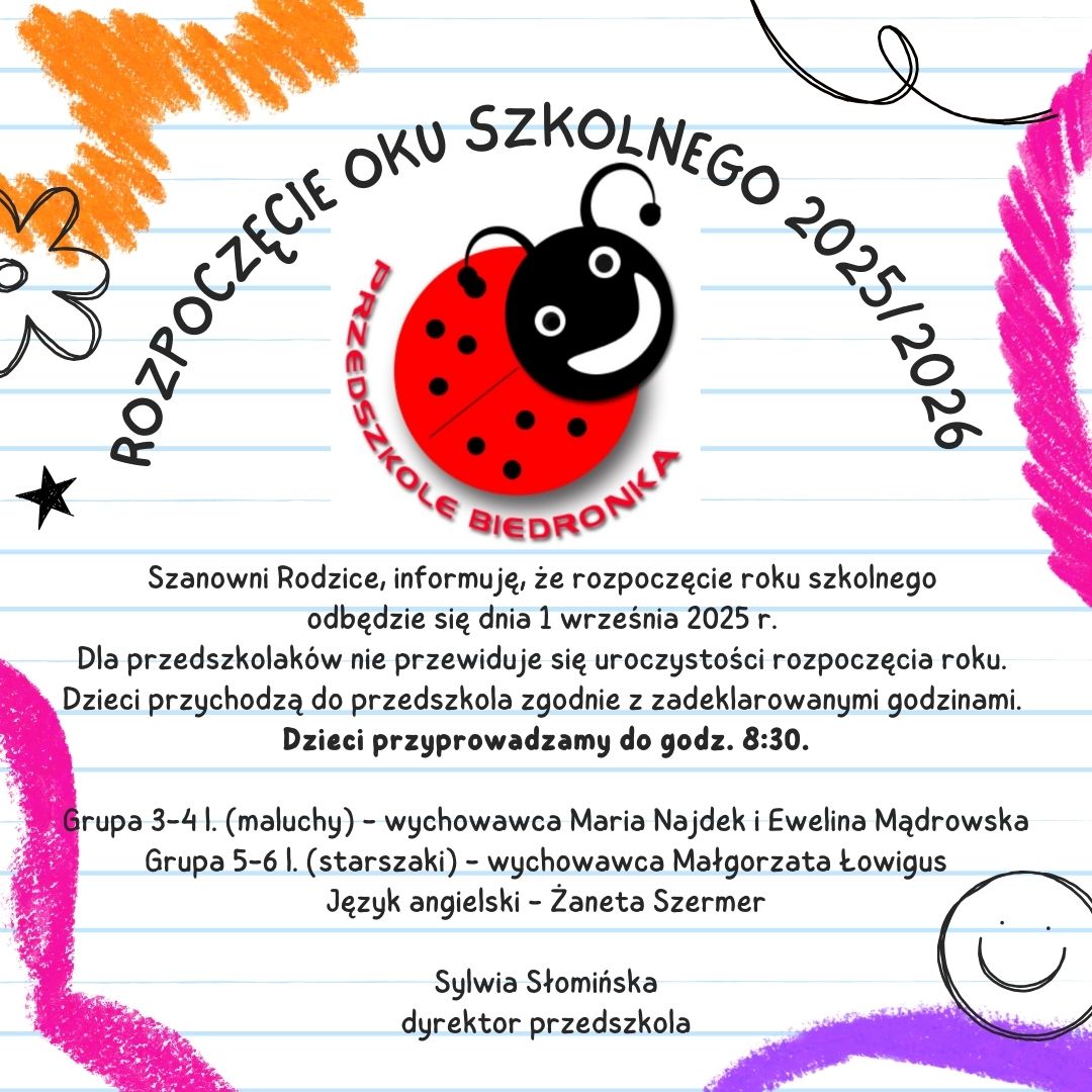 Nasze Przedszkole pełni dyżur w okresie wakacji letnich od 1 lipca do 18 lipca 2025 r.