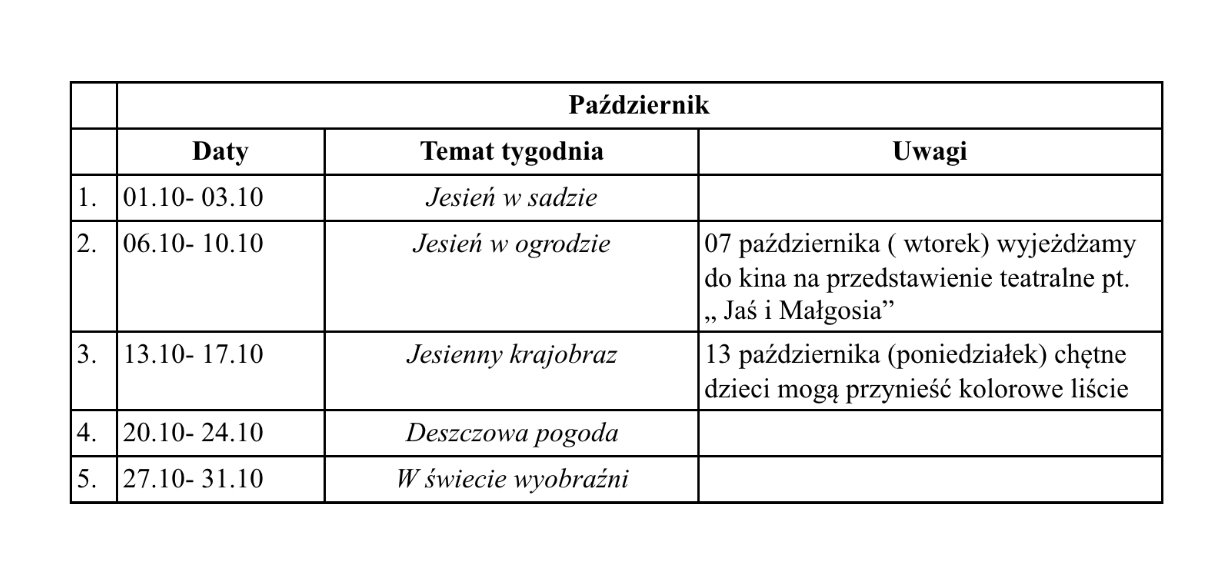07 października (wtorek) wyjeżdżamy do kina na przedstawienie teatralne pt. „ Jaś i Małgosia” |